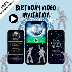 Turn up the funk and shine like a disco ball with this electrifying 70's Silver Disco Birthday Video Invitation! Inspired by the glittering disco era and the iconic “Blame It On The Boogie” vibe, this animated digital invite sets the stage for a celebration full of rhythm, sparkle, and retro style.
