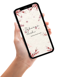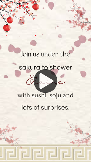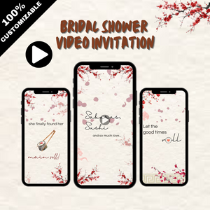 This Asian-inspired invitation features soft sakura pinks, delicate floral illustrations, and playful sushi elements, creating the perfect mood for a bridal shower that’s as serene as it is unforgettable.