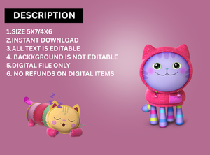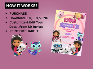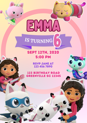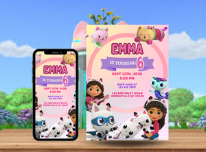 Bring your child’s favorite show to life with our Digital Gabby’s Dollhouse Birthday Invitation! Inspired by the colorful and creative world of Gabby and her adorable kitty friends, this custom digital invite is the perfect way to kick off a fun-filled celebration that feels just like stepping into a magical dollhouse adventure.