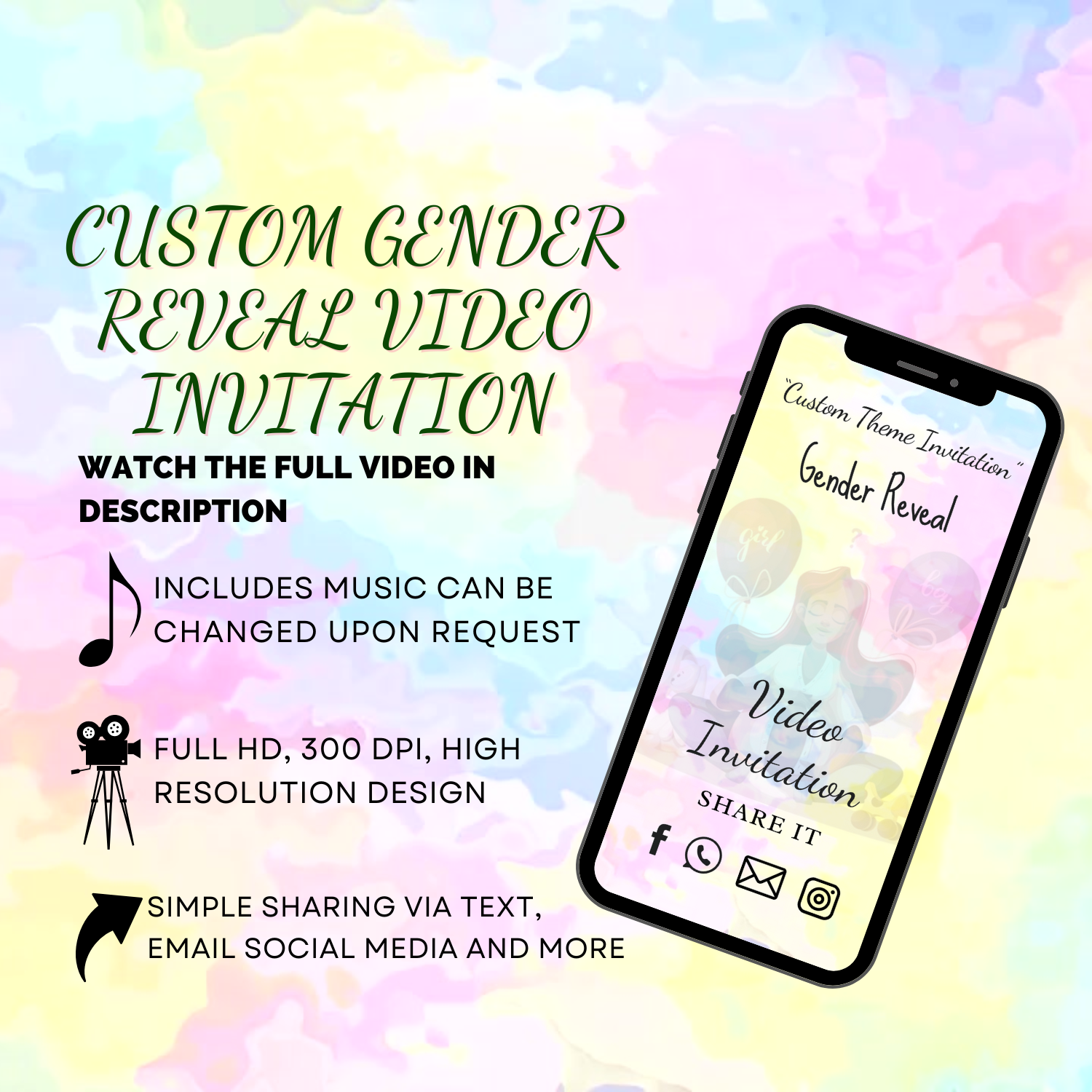 We’ll send your video invitation as an MP4 and card invitation as an jpg file to your email. You can download it and easily share it through Messenger, WhatsApp, iMessage, Email, or DM. You can also upload it to social media platforms like Facebook, Instagram, and Pinterest.