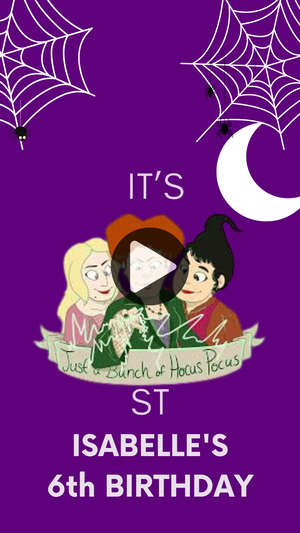 It’s just a bunch of Hocus Pocus and a whole lot of fun! Our Hocus Pocus Birthday Video Invitation is the perfect spellbinding start to a magical birthday celebration. With wickedly fun animations, enchanted music, and your personalized party details, this digital invite brings the magic of the Sanderson Sisters to life!