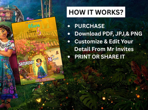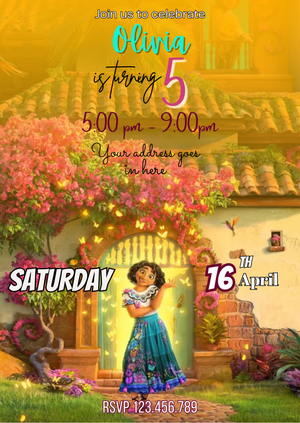 Bring the charm, color, and music of Encanto to life with this beautifully designed digital birthday invitation. Inspired by the beloved characters and vibrant setting of the magical Madrigal family, this invite sets the perfect tone for an unforgettable fiesta.