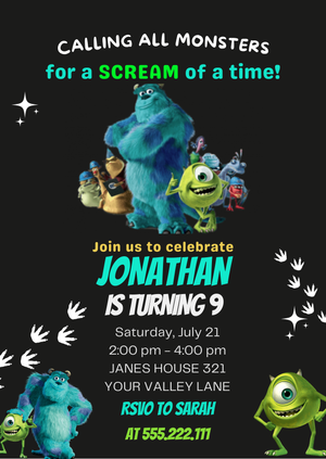 Start the party with laughter and let Sulley & Mike help you welcome your guests in monster style! Order your personalized digital invitation today and make it a birthday to remember! 🎂🎈👟