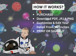 Perfect for young explorers, dreamers, and space enthusiasts, this beautifully designed invitation captures the 5 of a galactic journey. With a vibrant and customizable layout, it’s the ultimate way to invite friends and family to your child’s special day — all with the ease of digital sharing.