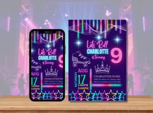 Get ready to roll into an unforgettable celebration! Our Neon Glow Roller Skating Digital Birthday Invitation brings bright lights, bold colors, and non-stop energy to your child’s special day.