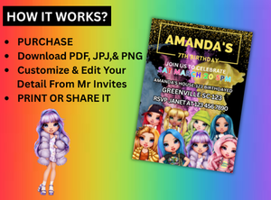 Inspired by the vibrant style of Rainbow High, this digital invitation is perfect for your little fashionista’s big day. With bold, colorful graphics and a fully customizable design, it's the perfect way to set the tone for a stylish and unforgettable party.