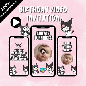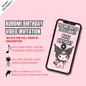 Cute, trendy, and totally unforgettable this Kuromi Video Birthday Invitation is perfect for fans of adorable style and playful fun. Whether it’s for your little one or a Kuromi-loving teen, this animated digital invite brings their favorite character to life in the cutest way possible.