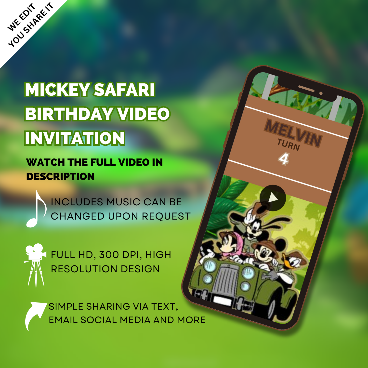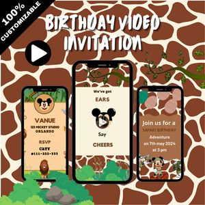 Kick off your little explorer’s birthday with a wild twist! Our Mickey Mouse Safari Birthday Video Invitation takes your guests on an animated jungle adventure with Mickey and friends. Personalized with your party details, this custom digital invite brings excitement, cuteness, and jungle vibes all in one!