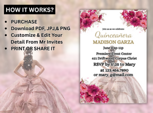 Vintage Pink & Gold Roses Quinceanera Party Card Invitation - Elegant Floral Party Digital invite