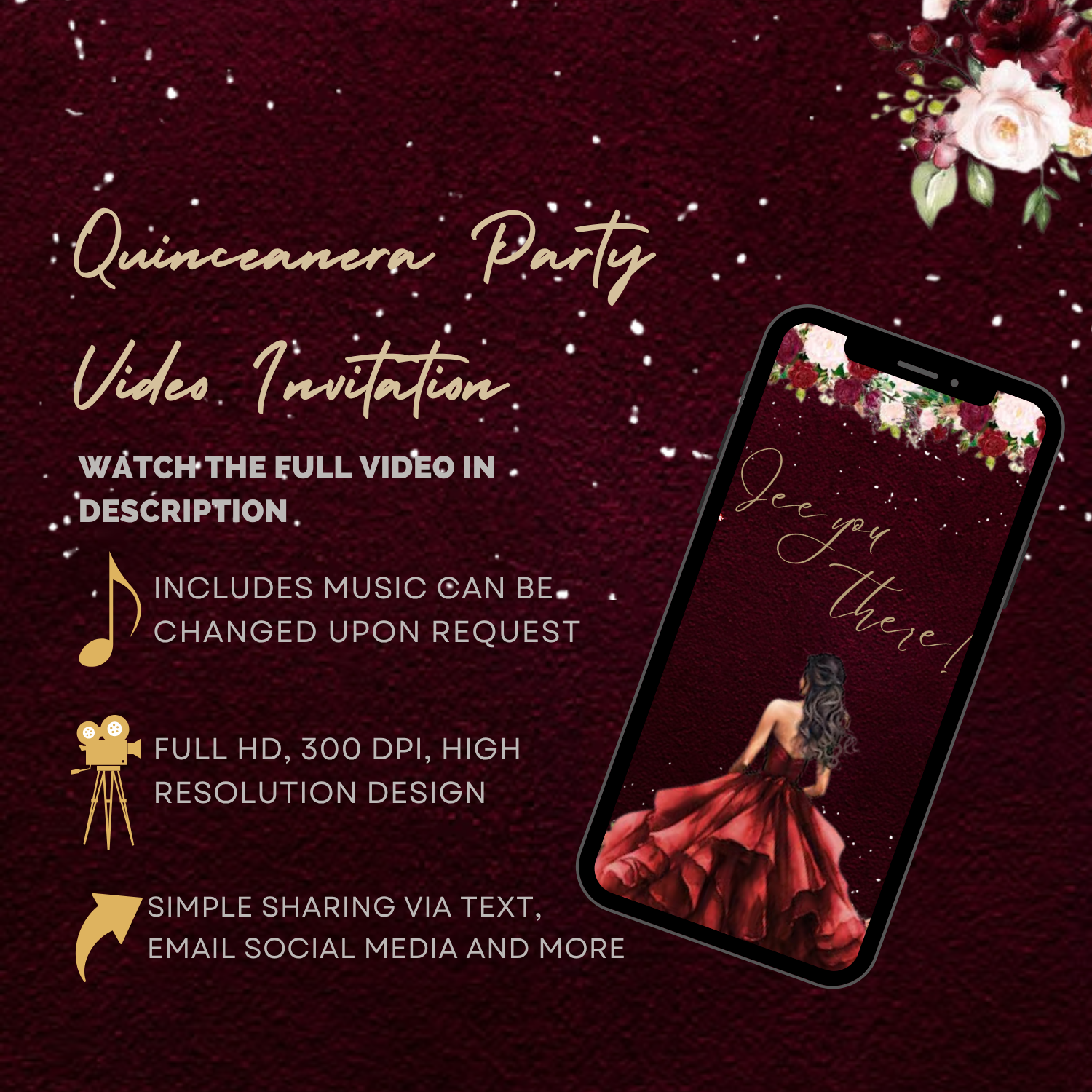 🌹✨ Burgundy Floral & Gold Quinceañera Video Invitation – Elegant Quinceañera Theme Digital Invite ✨🌹