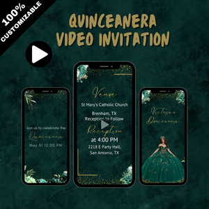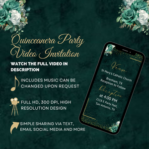 Announce her special day with timeless elegance through our Emerald Green & Gold Quinceañera Video Invitation. This luxurious digital design features deep emerald hues paired with radiant gold accents the perfect royal combination to reflect the beauty, grace, and significance of her Quince Años celebration.