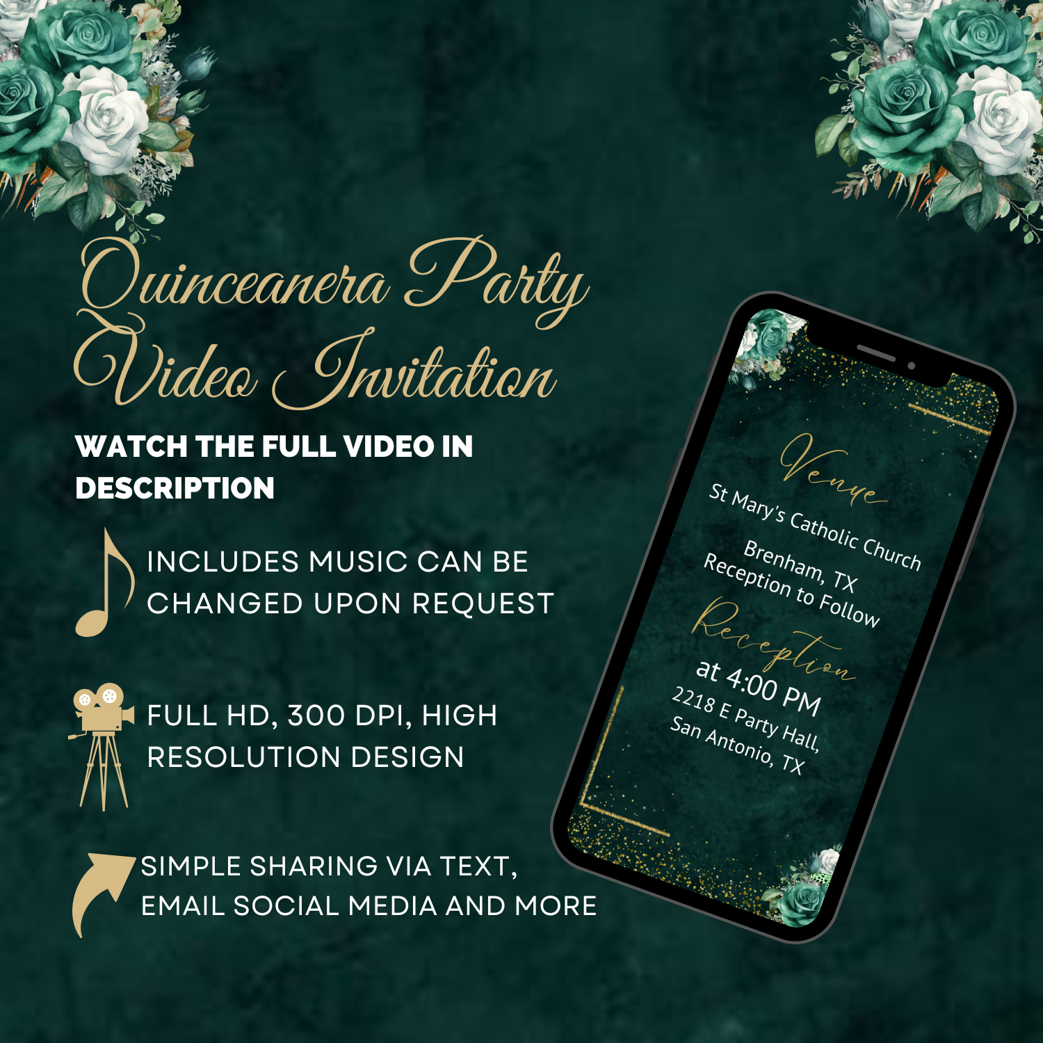 Emerald Green & Gold Quinceañera Video Invitation | A Royal Digital Experience for Her Unforgettable Quince Años