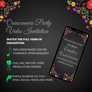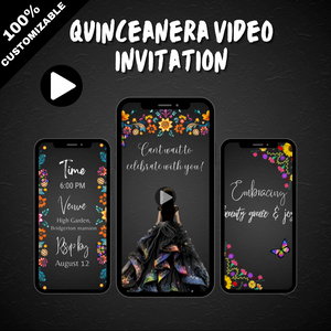 Celebrate your Quinceañera with bold beauty and vibrant tradition through our Mexican Fiesta Black Floral Video Invitation. Featuring stunning folk art floral elements on a sleek black background, this animated invite captures the spirit of a true fiesta festive, elegant, and full of life.