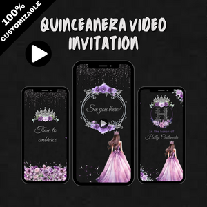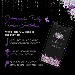 From sparkling silver crowns to deep royal purple accents, this Black, Purple & Silver Quinceañera Video Invitation sets the stage for a once-in-a-lifetime celebration full of elegance, beauty, and bold confidence.