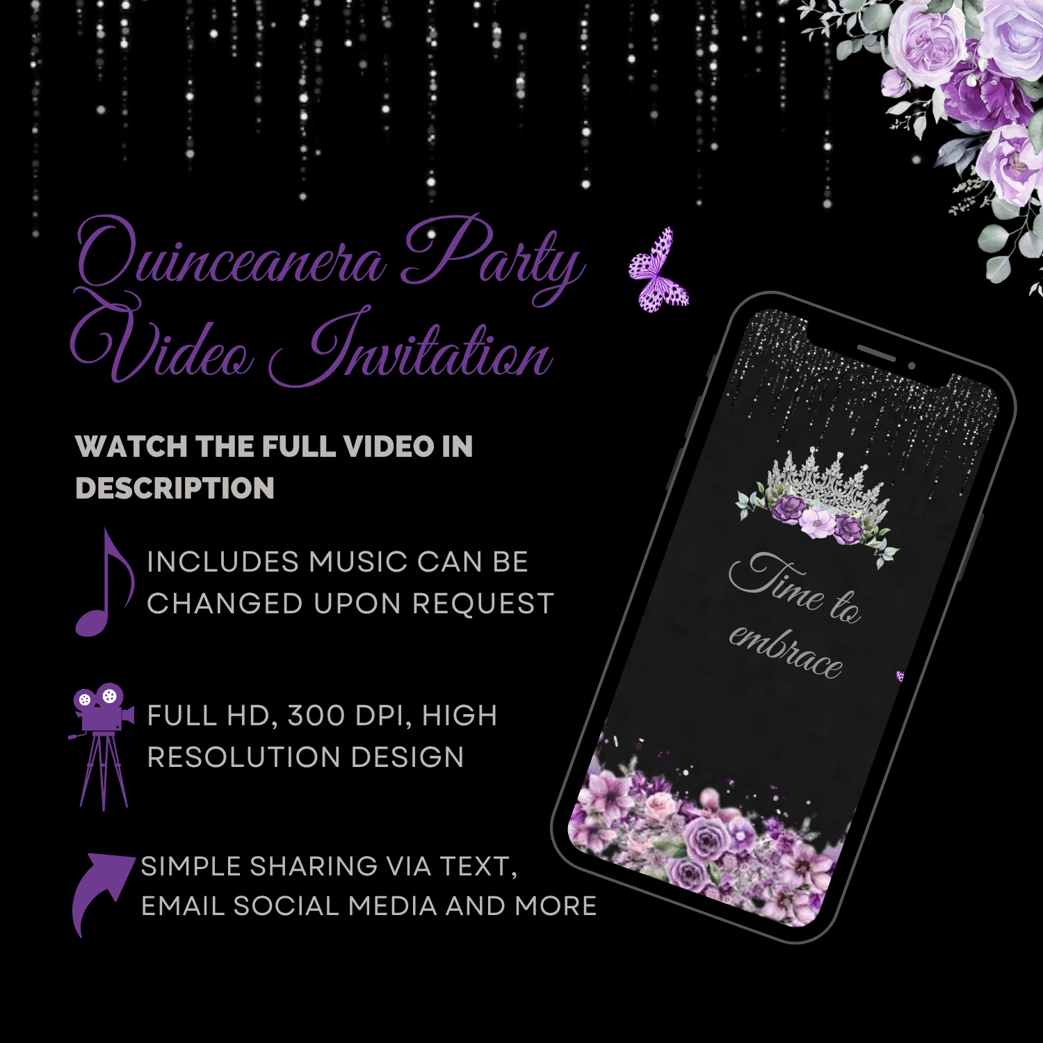 Step into your fifteenth year like a true queen with our Black, Purple & Silver Quinceañera Video Invitation – a stunning animated invite that combines elegance, glamour, and sophistication. Perfectly suited for a royal-themed birthday celebration, this digital invitation sets the tone for an unforgettable night of grace and grandeur.